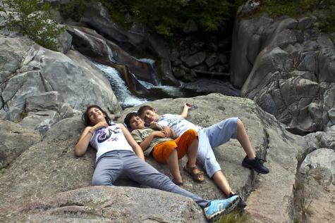 Drei Kinder liegen auf einer Felsplatte