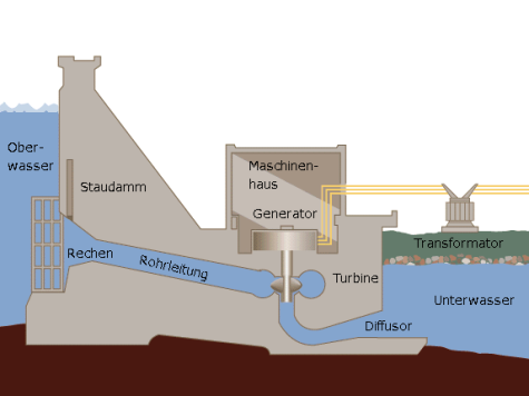 3. Turbinenantrieb: Das fließende Wasser treibt die Turbinen an, deren mechanische Bewegung einen Generator antreibt.
