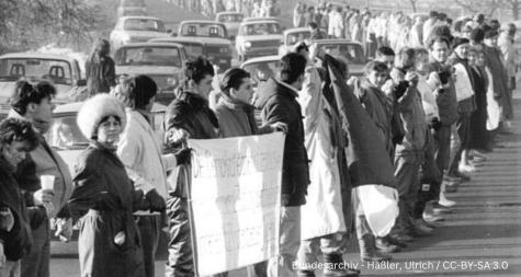 Ein weiteres inspirierendes Beispiel für gewaltfreie Aktionen bleibt die Menschenkette gegen die Aufrüstung in Deutschland. Vor mehr als 40 Jahren strömten Menschen aus allen Richtungen zusammen, um Hand in Hand eine Kette zu bilden - eine Kette des Protests und des Friedens. Sie reichte von Neu-Ulm bis Stuttgart und war über 100 Kilometer lang! Gemeinsam protestierten die Demonstranten gegen die Stationierung von atomaren Mittelstreckenraketen auf der Schwäbischen Alb und setzten so am 22. Oktober 1983 ein Zeichen, das weltweit Beachtung fand.