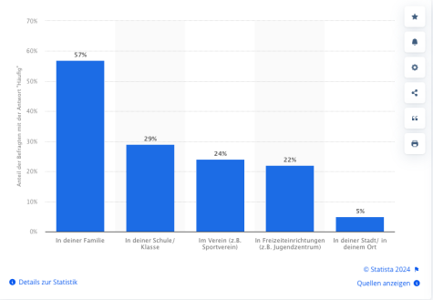 Partizipation beginnt im Elternhaus, wenn Eltern ihren Kindern Vertrauen entgegenbringen, ihre Meinungen ernst nehmen und sie in Entscheidungen einbeziehen. Die im Frühjahr 2024 befragten Kinder und Jugendlichen dürfen vor allem in der eigenen Familie häufig mitbestimmen. Dies zeigt, wie wichtig das familiäre Umfeld für die Entwicklung von Mitbestimmungskompetenzen ist. Knapp 30 Prozent der befragten Kinder und Jugendlichen gaben an, in der Schule bzw Klasse häufig mitbestimmen zu dürfen.