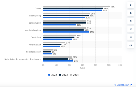 Die Statista Auswertung zeigt uns dramatische Zahlen: Auf die Frage, ob sie aktuell psychische Belastungen erleben, antworteten zwischen Januar und Februar 2024 deutschlandweit 51% der befragten Jugendlichen und jungen Erwachsenen mit "ja", sie litten derzeit unter Stress. Dies verdeutlicht, wie stark psychische Belastungen Jugendlicher und junger Erwachsener zunehmen und welche wichtige Rolle das Thema für ihre Generation spielt.