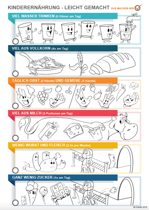 Gemäß den Empfehlungen des Bundesgesundheitsministeriums sollten Kinder täglich sechs Gläser Wasser (keine zuckerhaltigen Getränke) trinken, um ihren Flüssigkeitsbedarf zu decken. Eine ausgewogene Ernährung sollte reich an Vollkornprodukten, Obst und Gemüse sein, um eine Fülle von Vitaminen, Mineralstoffen und Ballaststoffen bereitzustellen. Mehrere Portionen Milch oder Milchprodukte liefern Kalzium für starke Knochen und Zähne. Der Konsum von Wurst und Fleisch sollte auf ein Minimum reduziert werden, während zuckerhaltige Lebensmittel und Getränke nur in begrenzten Mengen verzehrt werden sollten, um das Risiko von Karies und Übergewicht zu verringern. Durch die Förderung solcher Ernährungsgewohnheiten können Eltern und Betreuer einen wichtigen Beitrag zur langfristigen Gesundheit ihrer Kinder leisten. Sinnvolle Anregungen findet man auch bei der Deutschen Gesellschaft für Kinder- und Jugendmedizin.