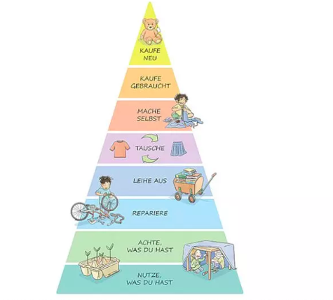 Die Konsumspirale kann durch bewusste Entscheidungen und Verhaltensänderungen durchbrochen werden. Gebrauchtkauf reduziert die Nachfrage nach neuen Produkten und verlängert die Lebensdauer bestehender Güter. Selbstgemachte Artikel fördern Kreativität und minimieren den Bedarf an gekauften Produkten. Tauschen ermöglicht den Austausch von Waren ohne finanzielle Belastung, während Ausleihen den vorübergehenden Gebrauch von Gegenständen ermöglicht, ohne sie besitzen zu müssen. Reparieren statt Wegwerfen verlängert die Nutzungsdauer von Produkten und reduziert Abfall. Die Nutzung vorhandener Ressourcen, wie Kleidung oder Elektronik, anstatt neue zu kaufen, verringert den ökologischen Fußabdruck und spart Ressourcen. Auch Straßenflohmärkte, bei denen Kinder ihre "alten" Spielsachen verkaufen macht viel Sinn. Diese Praktiken entsprechen der Konsumpyramide, die einen nachhaltigen und bewussten Konsum fördert, indem sie den Fokus auf die Verlängerung der Produktlebensdauer und die Reduzierung von Verschwendung legt.