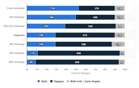 Aus den Reihen der Grünen gibt es derweil Zustimmung zum Ringtausch, die Union allerdings beharrt weiter auf der Taurus-Lieferung, um die Ukraine effektiver zu unterstützen. Besonders der CDU-Vorsitzende Friedrich Merz oder CSU-Chef Markus Söder haben sich immer wieder für die Waffenlieferung eingesetzt. Eine aktuelle Umfrage von ARD-DeutschlandTrend unterstützt den Bundeskanzler in seiner Haltung: Die Mehrheit der Deutschen lehnte eine Taurus-Lieferung ab (tagesschau 2024). Kritische Stimmen vermuteten zudem eine Spaltung der Ampel-Koalition als eigentliches Motiv des Union-Vorstoßes.