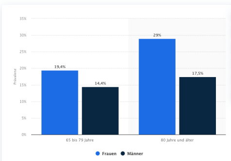 Das Robert Koch-Institut (RKI) hat zwischen 2021/22 Personen ab 65 Jahren in Deutschland zu ihrem Gesundheitszustand und möglicher Einsamkeit befragt. Dabei gaben 29% der Frauen über 80 an, dass sie sich einsam fühlen.